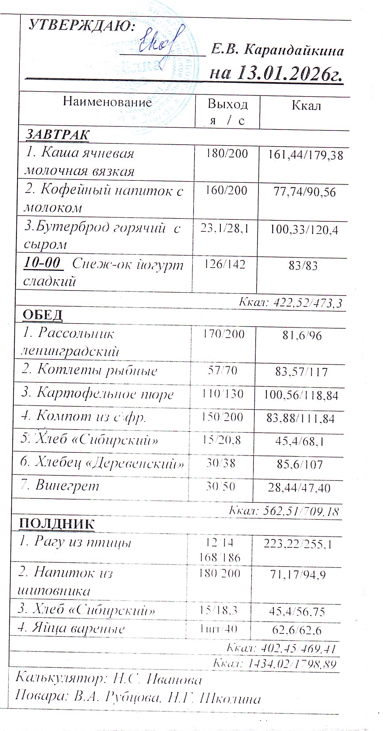 Для обеспечения разнообразного и полноценного питания воспитанников в МБДОУ и дома, родителей (законных представителей) информируют об ассортименте питания воспитанников, вывешивая ежедневное меню в каждой групповой ячейке. В ежедневном меню указывается наименование блюда, объем и калорийность порции. Индивидуальное меню для детей-инвалидов и детей с ограниченными возможностями здоровья (ОВЗ) не предусмотрено ввиду отсутствия потребности.
